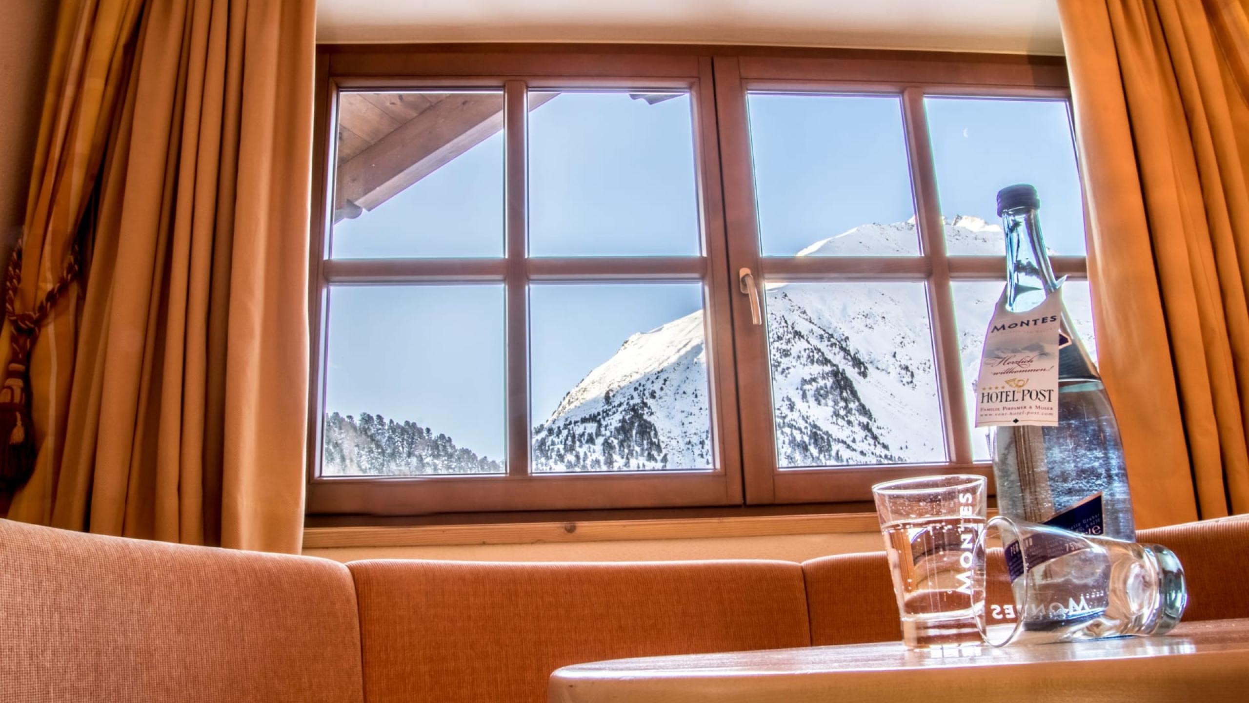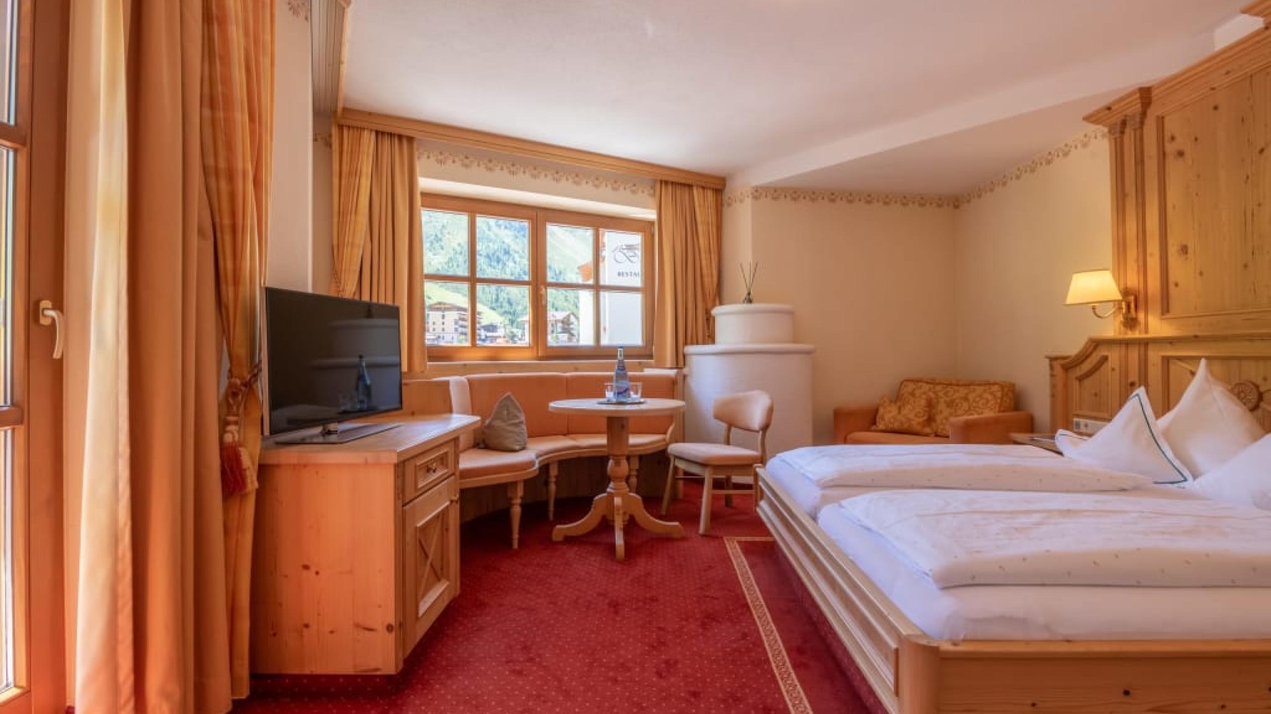Wonderful double room (ca. 31 m²) designed in matured timber, with cosy living area, pull-out couch, desk, corner-seating unit with tiled stove, bathroom with bath and sparate WC, Wifi, telephone, radio, TV, room safe and balcony
