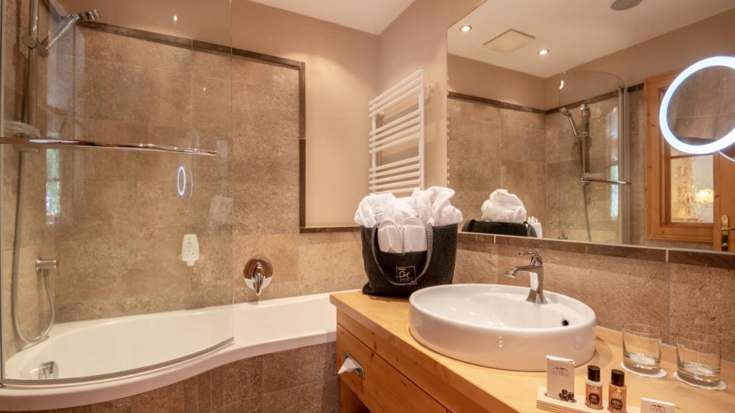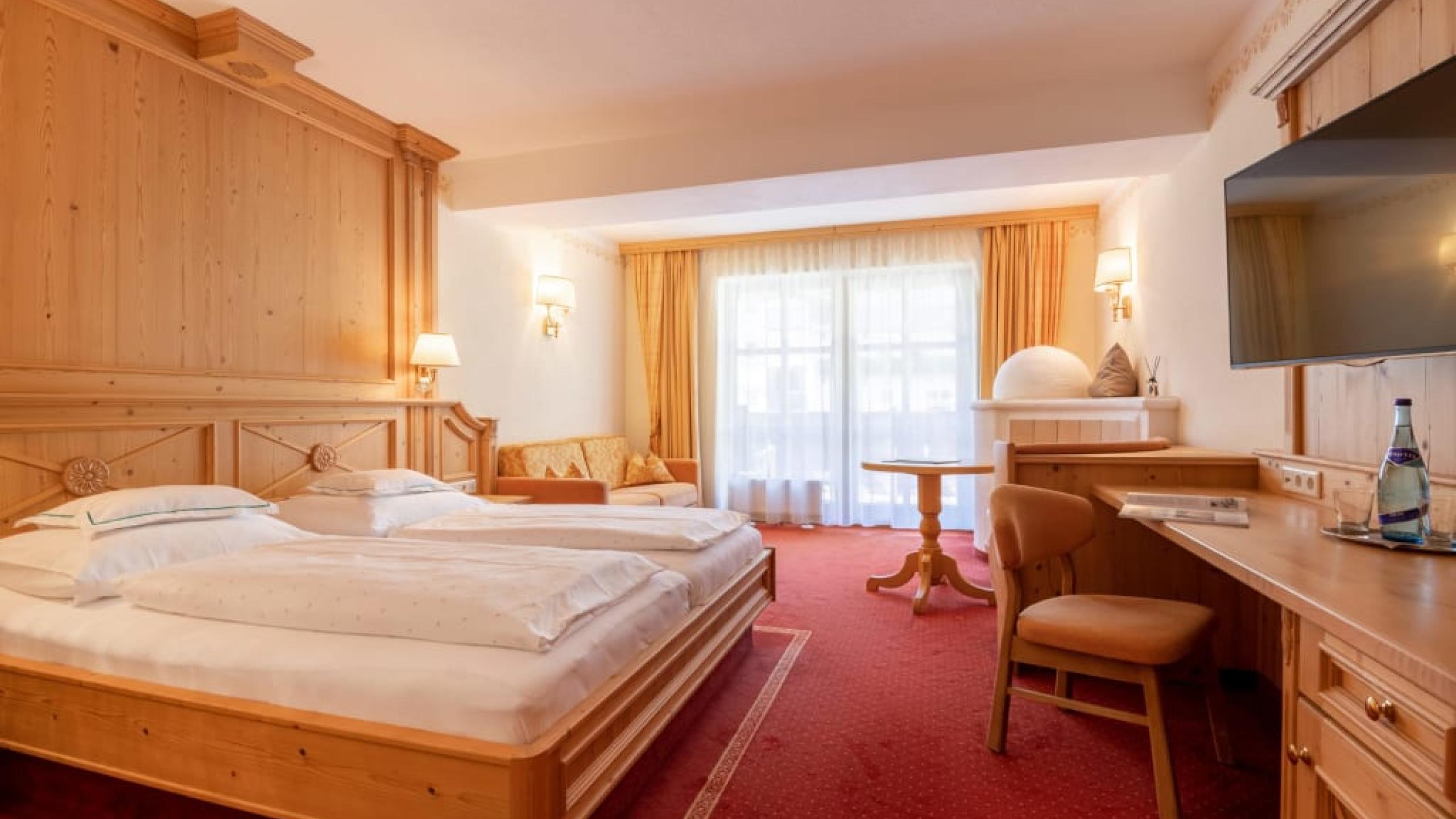 Suite (36 m² env.) merveilleusement aménagée en vieux bois avec coin séjour confortable, canapé convertible, bureau, coin du feu autour du poêle en faience, salle de bain avec baignoire et WC séparés, connexion Internet, téléphone, radio, TV, coffre-fort, balcon.