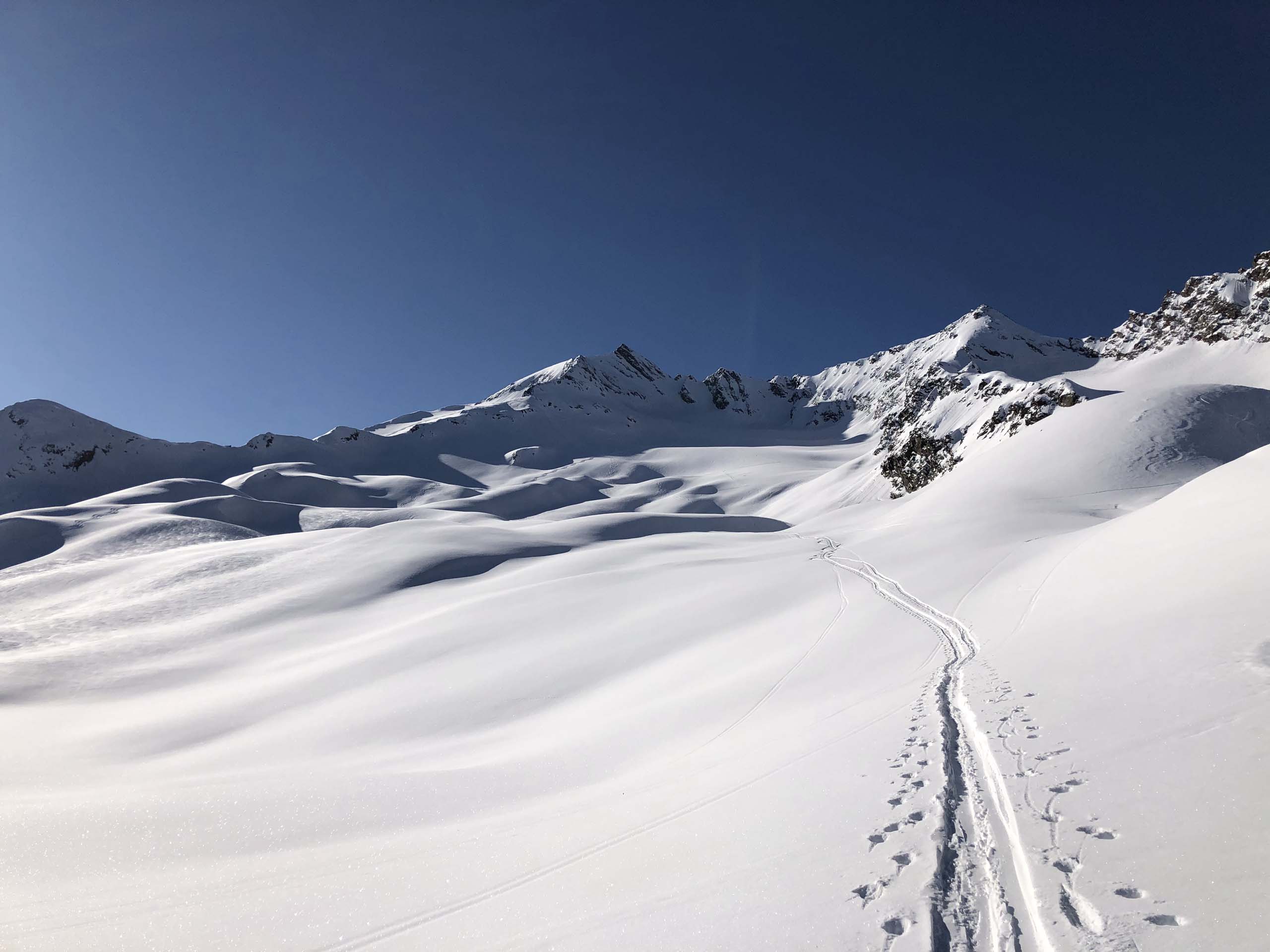 Die Abfahrt lässt verschiedene Varianten zu. Wir empfehlen die Fahrt über den ersten Steilhang der schwarzen Piste – natürlich abhängig von den Schneeverhältnissen vor Ort. Wie schaut es mit der Sicherheit aus? Die Tour gilt als ziemlich sicher, da sie größtenteils im Skigebiet verläuft. Dennoch sollten Sie zu den Steilhängen einen großzügigen Sicherheitsabstand wahren. Das Beste: Diese Tour eignet sich perfekt für die Zeit nach Saisonende. Denn hier hält sich aufgrund der Höhenlage der Schnee mit etwas Glück bis in den Juni hinein.