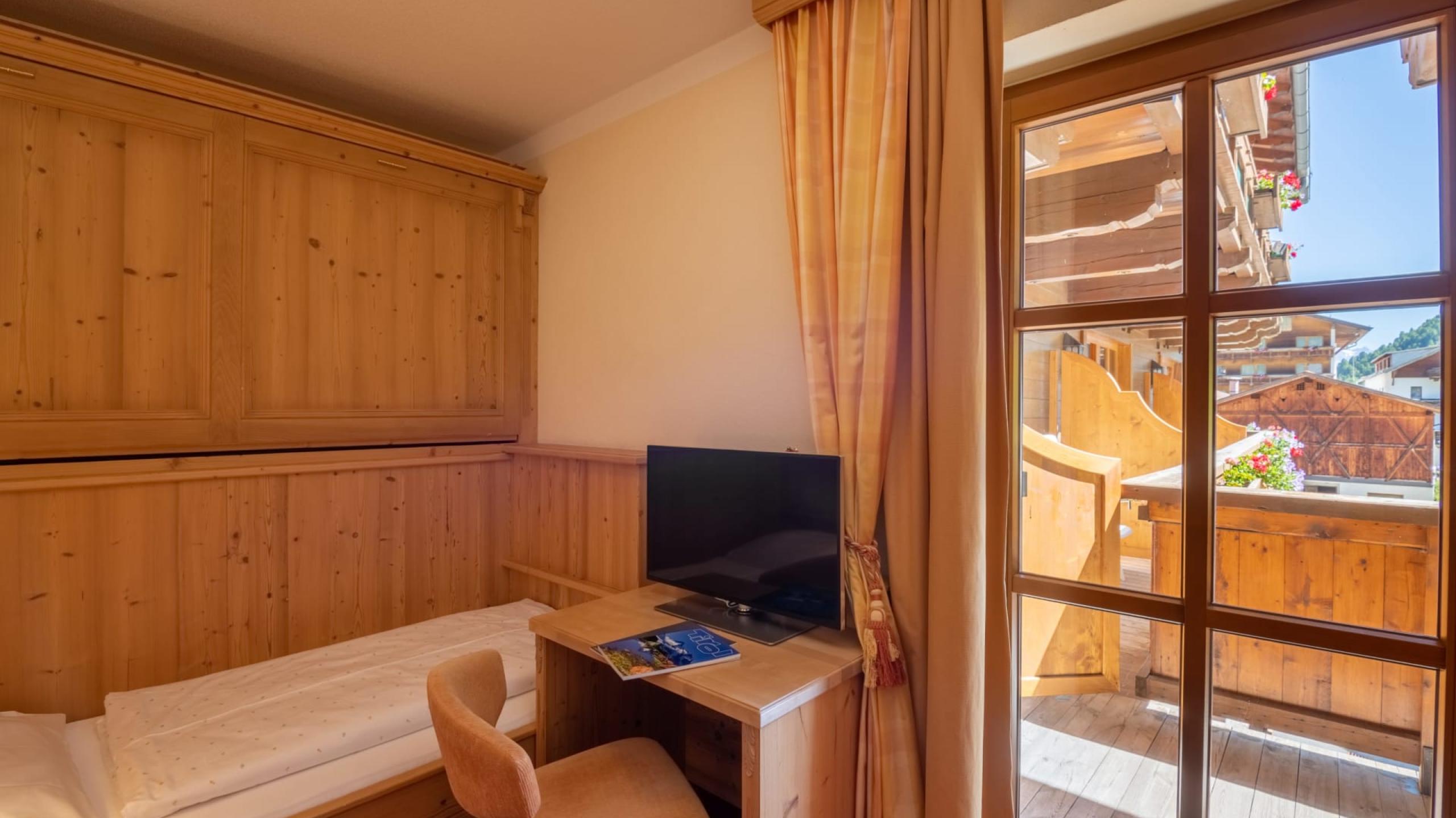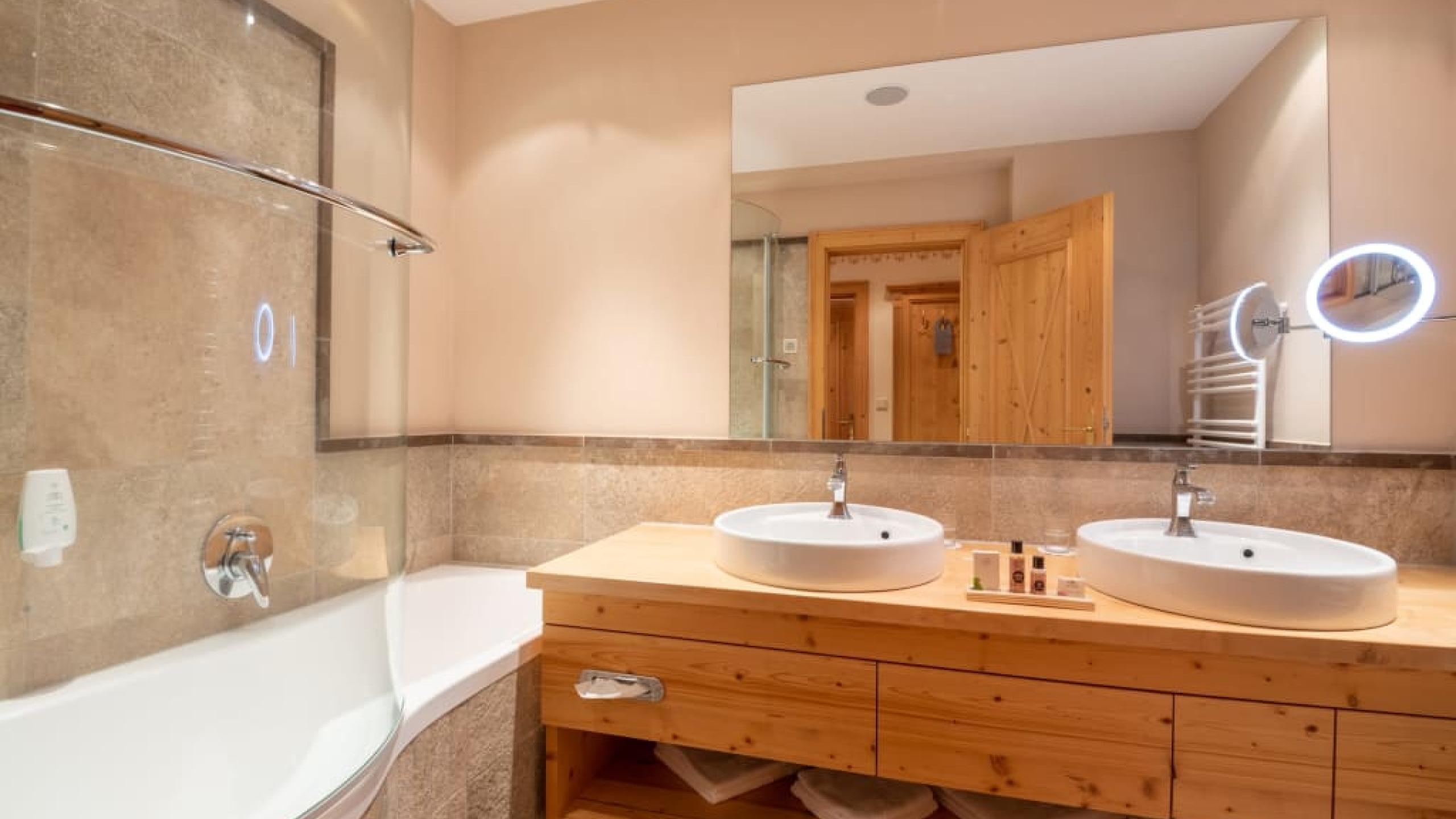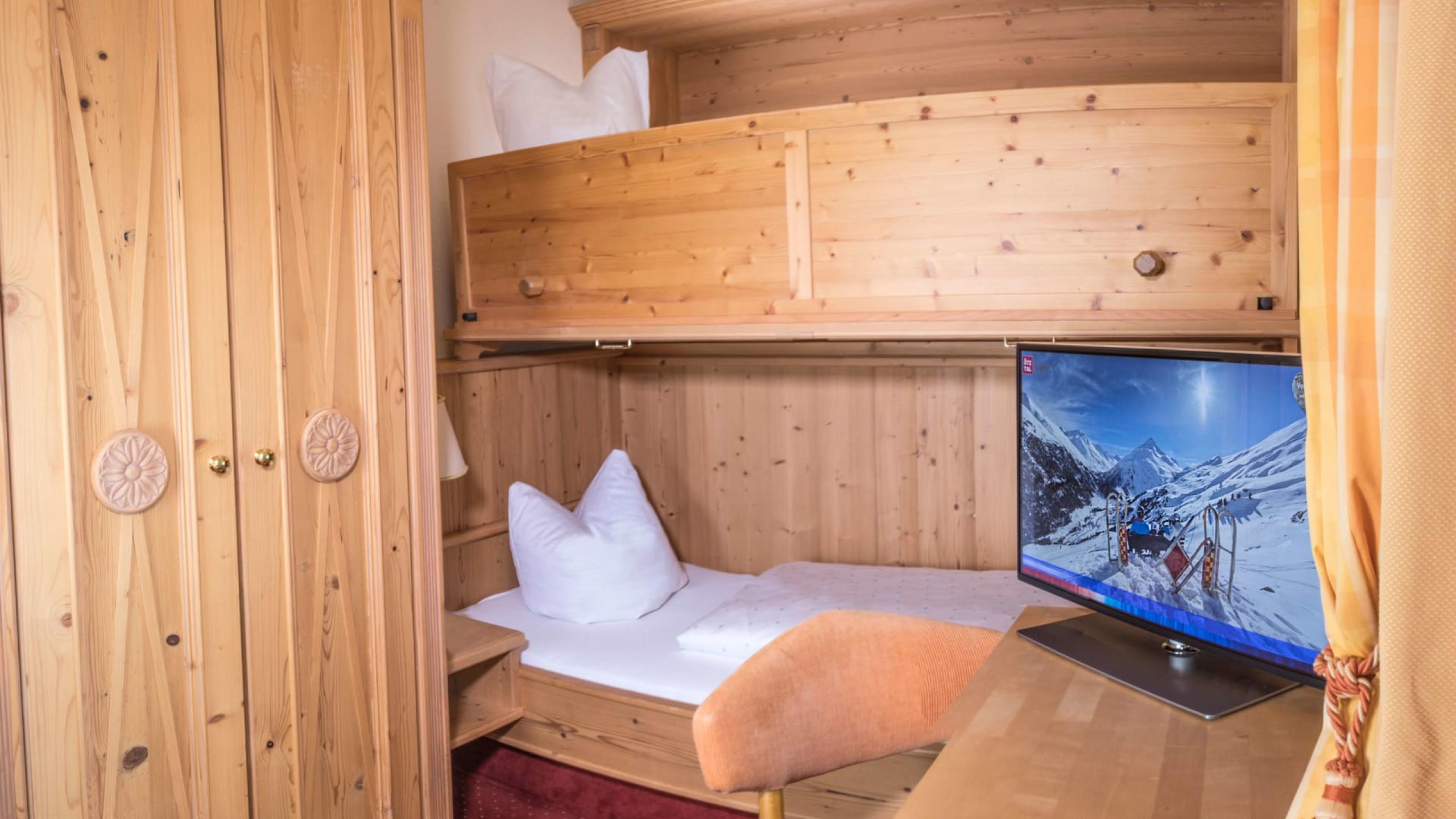 Wunderschön in Altholz gehaltene Suite (ca. 51 m²) mit Balkon, mit separatem Einzelzimmer bzw. Kinderzimmer mit Stockbett, gemütlichem Wohnbereich mit Schreibtisch, Ausziehcouch und Sitzecke mit Kachelofen, Telefon, Radio, 2 TVs, Wifi, Zimmersafe, Bedezimmer mit Badewanne, Doppel-Waschbecken und Föhn, separates WC.